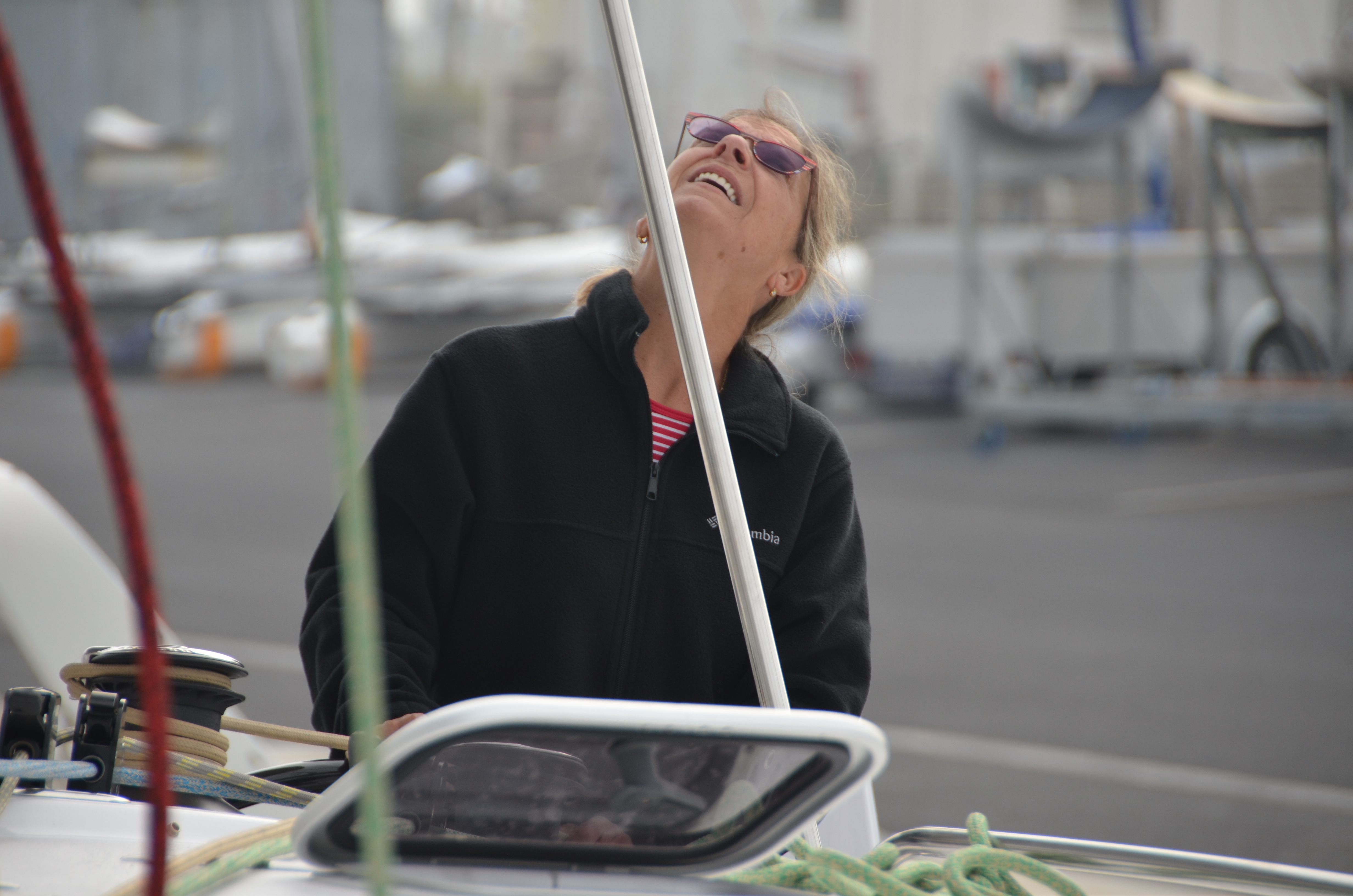 Claudia using the electric winch and topping lift