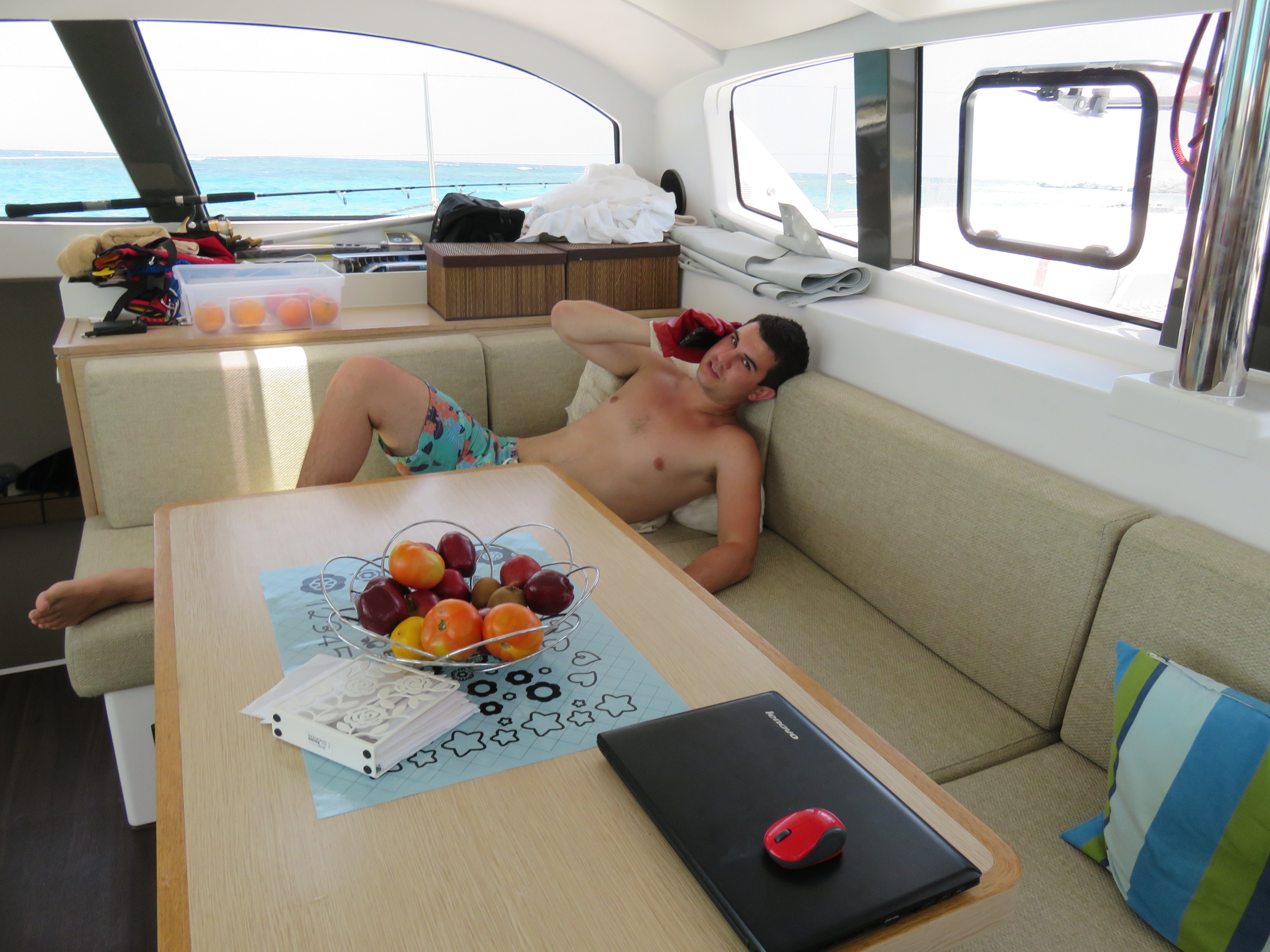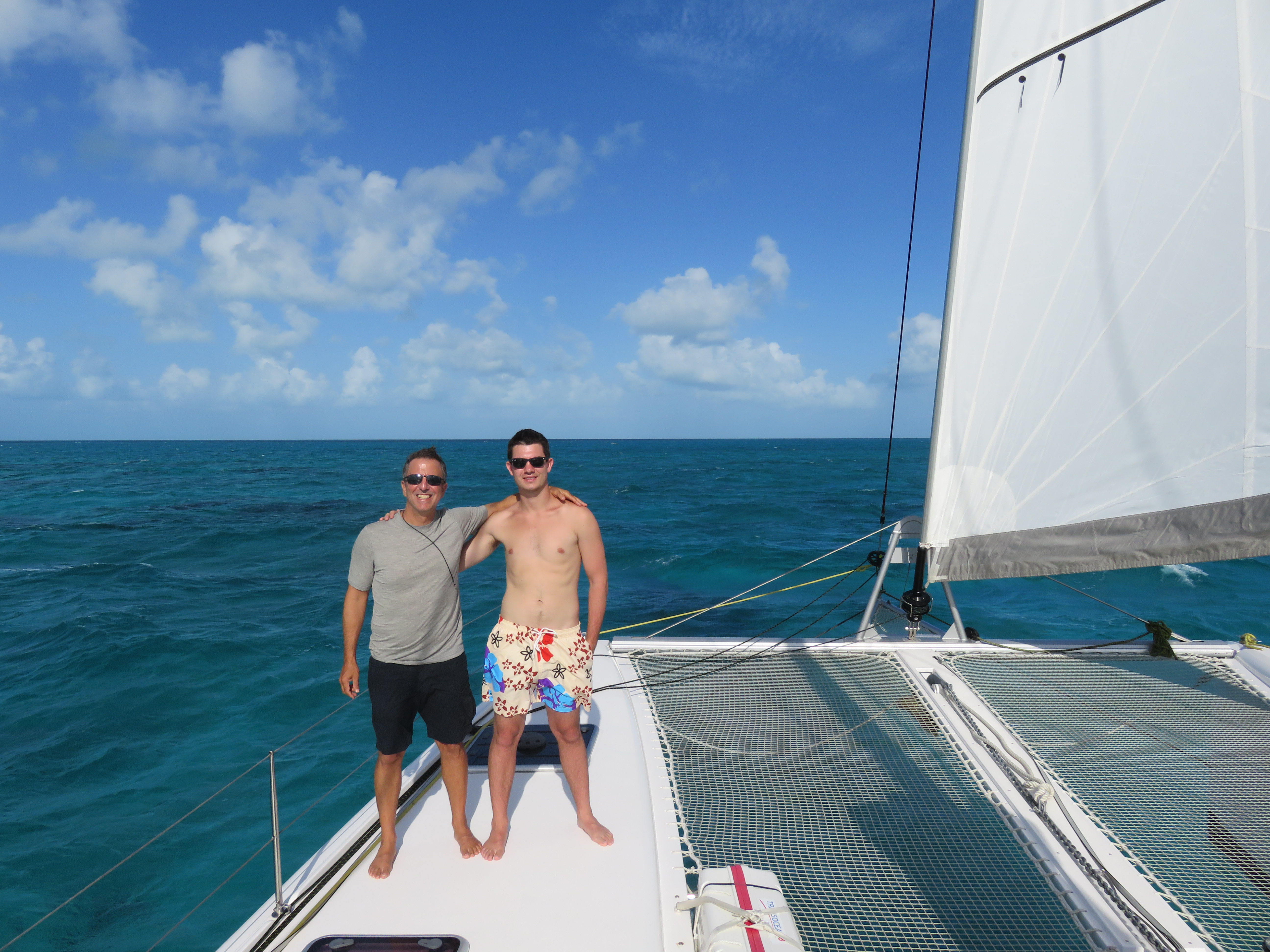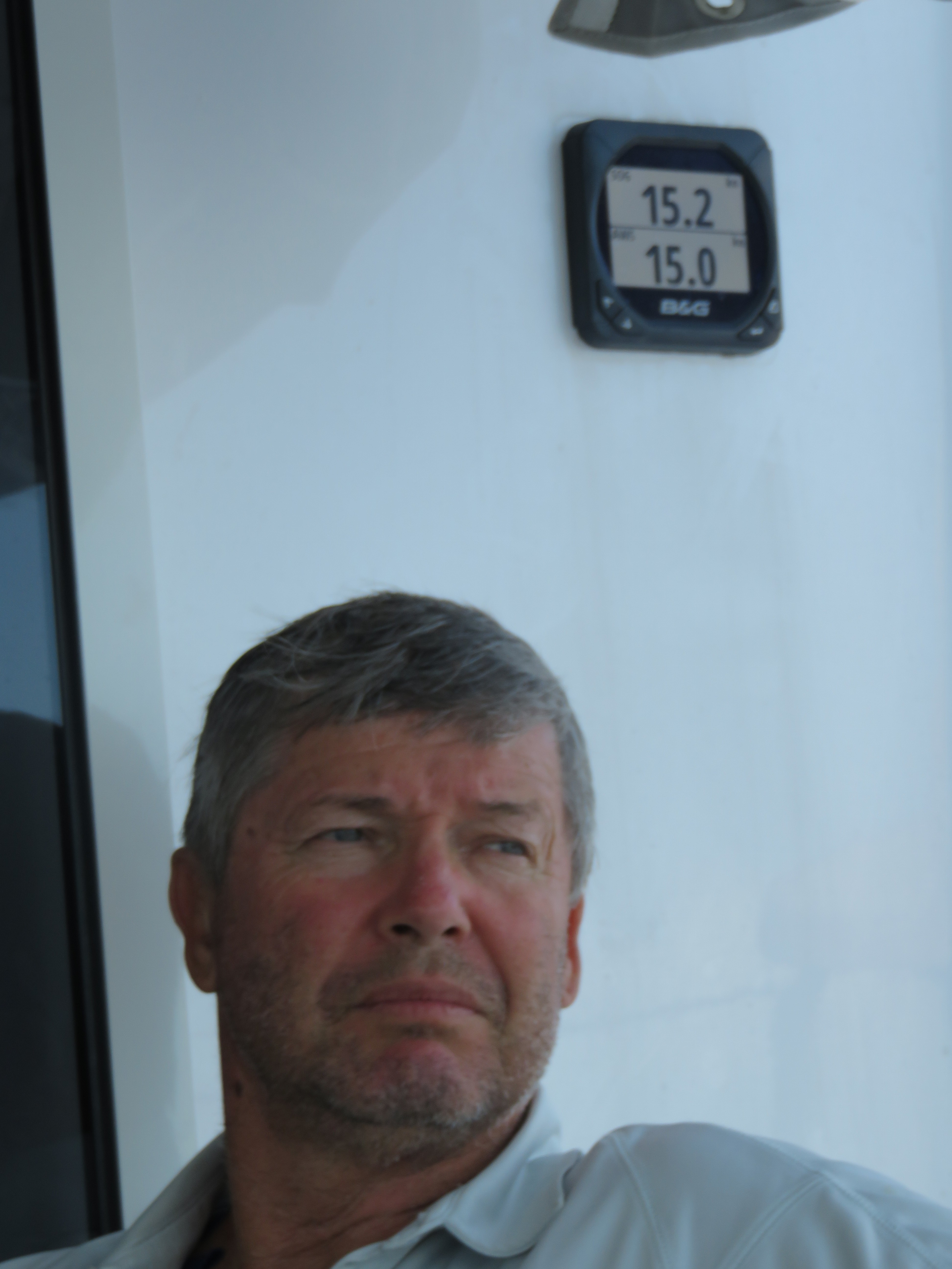 When we left for Long Island, Bahamas, the wind kicked up to 29 knots. Check out the wind instrument showing us ripping at 15.2 knots with an apparent wind of 15 knots. We peaked at 18.7 knots. A former Motor-Cross champion, Jan wanted more speed.